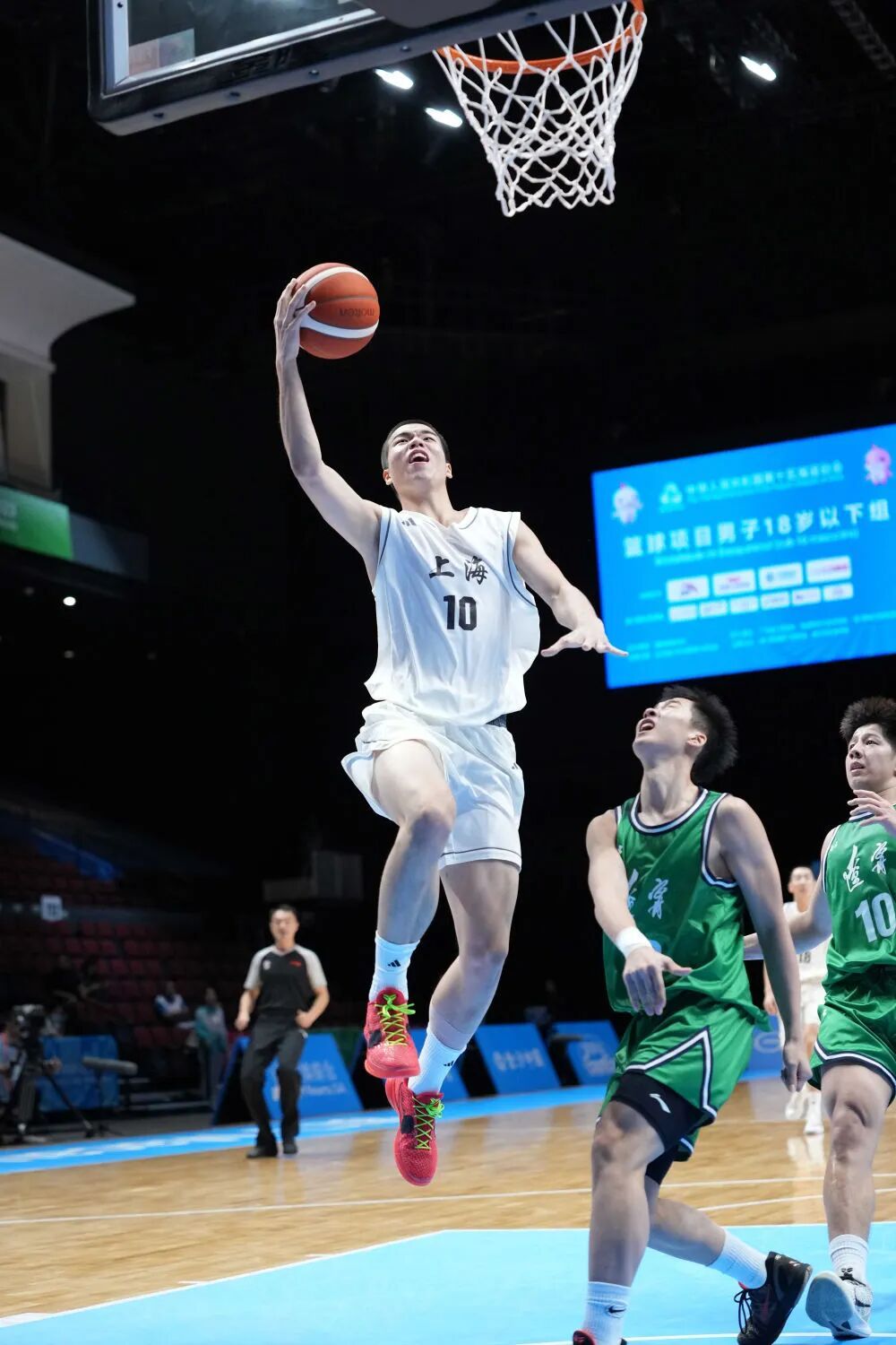 防守他的白队10号是上海队的张懿赵杰,出生于2010年的他身高超过2米,已经跳级打过不少U17、U18赛事,今年他随U16男篮国家队获得亚洲杯亚军并入选赛事最佳阵容。张懿赵杰并非用来专门消耗李悦洲的球队苦力或者蓝领,而是勇于担当,服从指挥的球队主力。