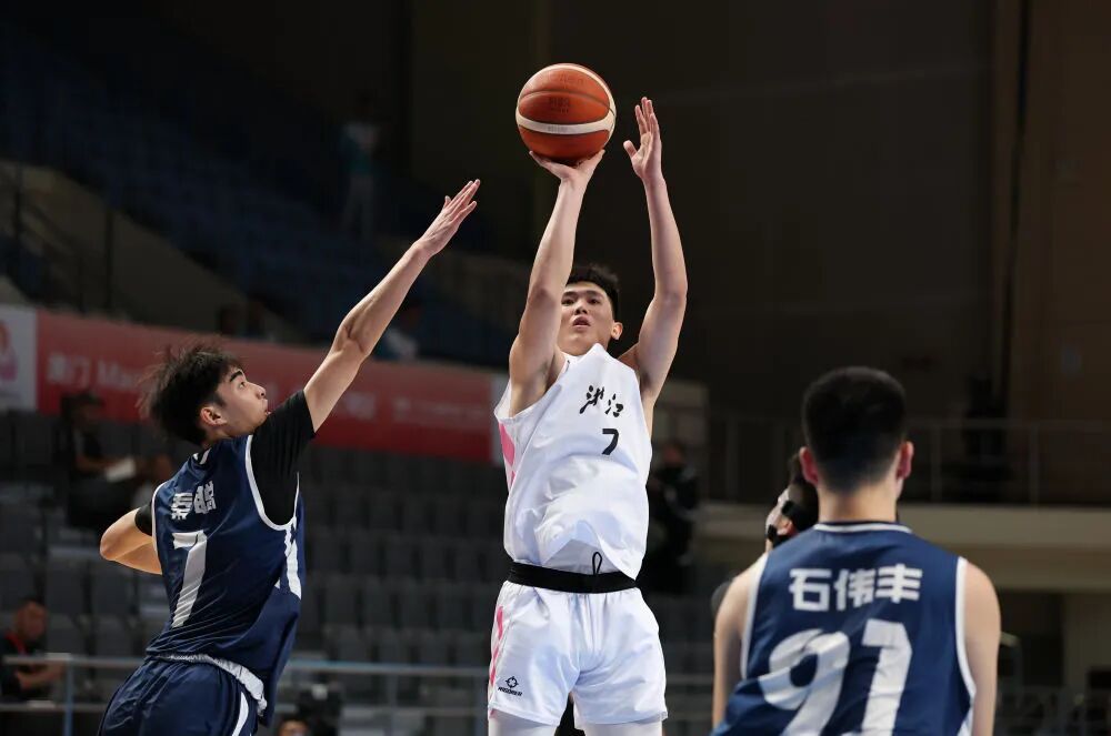 △ 11月10日,浙江队球员李悦洲(中)在比赛中投篮。当日,在澳门举行的第十五届全国运动会篮球男子18岁以下组小组赛中,浙江队106比71战胜湖南队。新华社记者 孙凡越 摄